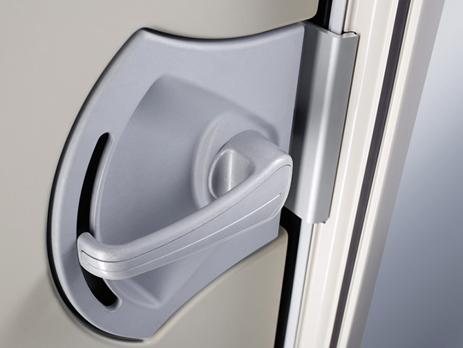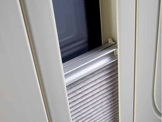 這款車門的固定窗戶和新穎設計使房車盡享明亮。CaraD-400F配備合成單面百葉簾和隱蔽鉸鏈。