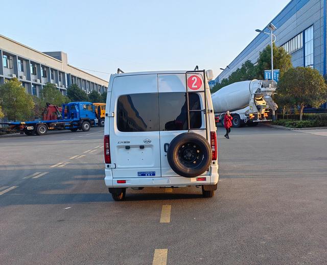 車身后面還有一個備胎,雖然放置的位置不是很好看,但是很方便啊,在高速公路上出現(xiàn)爆胎的話,我們可以快速的拆卸備胎并更換上去,而后爬梯就是為了讓我們方便上到車頂清洗車頂或者是維修的,而車頂兩邊護欄是在我們把東西放到車頂后進行捆綁的。