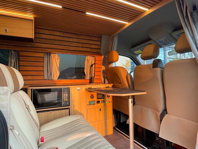 駕駛室后方就是廚房區(qū)域了,在這里有雙人沙發(fā)座椅、便攜式餐桌,用餐時可以坐兩個人,不用餐的時候可以將餐桌放到后面,平時還可以在這里辦辦公,而廚房吧臺還配備微波爐、50升房車專用冰箱、304不銹鋼洗菜池等設(shè)施,一家人出去露營的話,可以把準備好的食物都放到冰箱里,到了露營地我們將需要烤的食物直接放進微波爐,洗菜池下面就是各種開關(guān)以及電瓶動態(tài)顯示機器。