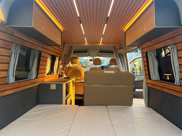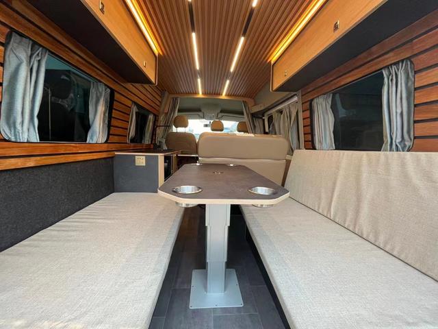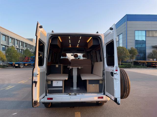 車輛最后方就是我們的會客區(qū)了,會客區(qū)由雙排固定沙發(fā)組合而成的,可以坐3-4個人,會客區(qū)的餐桌則是氣動升降的,餐桌上帶4個杯托,四個人在這里打打撲克喝喝咖啡都是可以的,而到了晚上我們將氣動升降桌降下來就是一張長2米、寬1.5米的三人大橫床,能睡下兩個成年人和一個5-6歲的小孩,一家三口出去露營在適合不過了,上方還有兩排儲物吊柜,日常露營所需要用到的物品都可以放里面,避免下次出門忘記帶了。