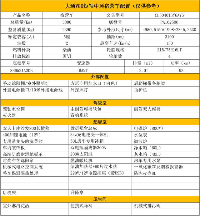 這輛上汽大通V80的露營車整車長5米、寬2米、高2.3米,荷載5人,這個尺寸是可以下地庫的,在國內(nèi)只要限高不低于2米5的,都是可以通行的,這就減少了我們繞路的風(fēng)險,車頂還配備了200瓦太陽能板,左側(cè)還有一個長2.5、寬2米的遮陽棚以及戶外照明燈,在冬季我們可以坐在遮陽棚下面曬曬太陽看看書都是可以的,下方還有重力加水口,主要是給凈水箱加水的,從外觀尺寸來說的話,這款露營車是適合家用的,回家了就可以停到地下停車場了,不用擔(dān)心沒有地方停。